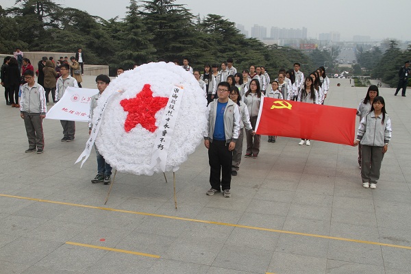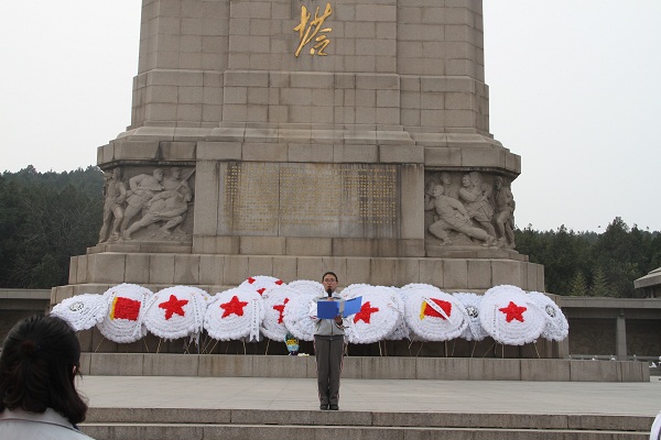 祭扫学生身着校服,在旗帜的引领下秩序井然地走到淮海战役纪念塔下,全体肃立。主持人正式宣布活动开始之后,奏响了中华人民共和国国歌,学生代表为革命烈士进献花圈。在沉重的哀鸣声中全体同学默哀三分钟,表达对革命先烈的追思。默哀完毕,学生代表闫云致悼词,表示作为当代大学生,要铭记历史,珍爱和平,要继承先烈遗志,树立新风,励志成才,践行社会主义核心价值观,为实现伟大的中国梦而共同奋斗。最后,全体同学怀着深深的哀悼与敬仰之情沿着纪念塔绕行一周,共同瞻仰屹立于风雨之中的淮海英雄纪念碑。