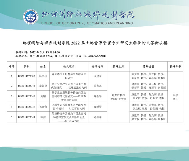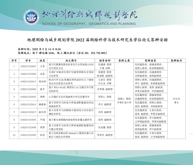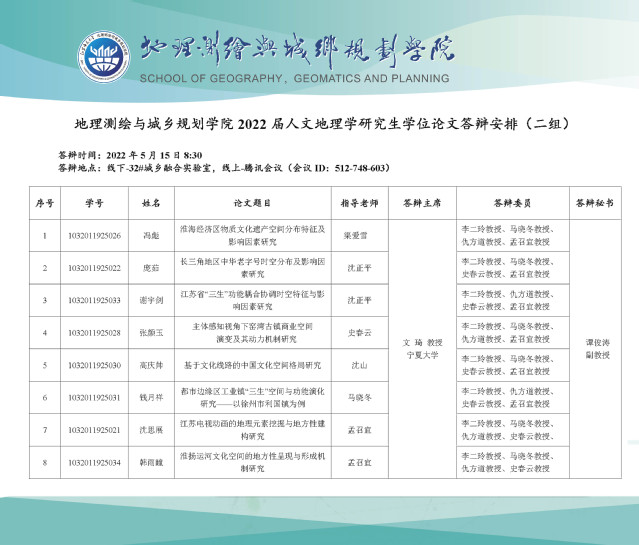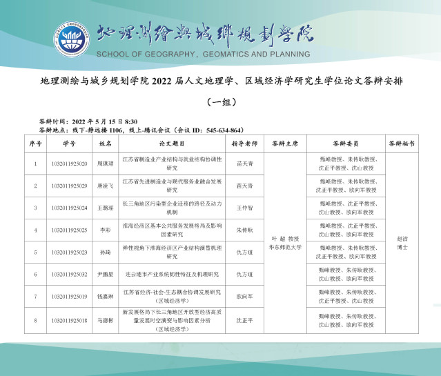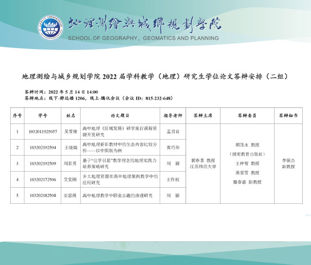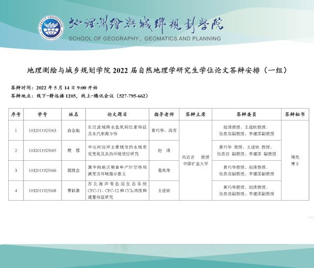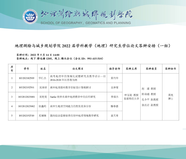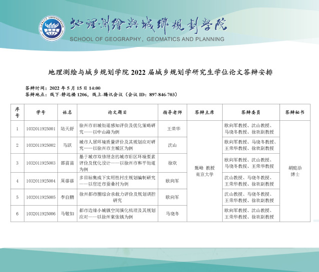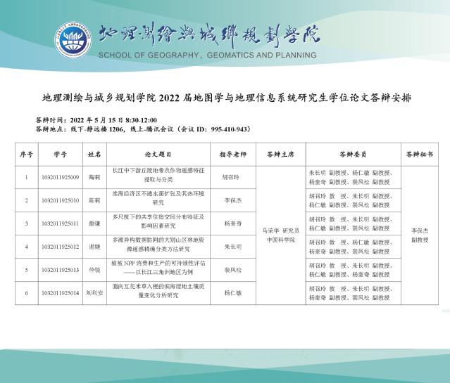 根据《关于做好2022年上半年研究生学位论文答辩和学位授予工作的通知》(研发〔2022〕26号)通知要求,现将我院2022年上半年硕士研究生学位论文答辩信息公示如下: