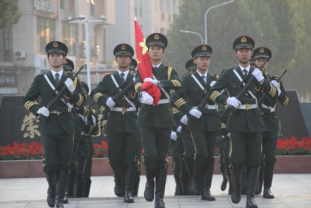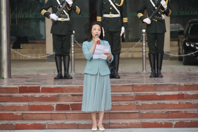 早上7时整,升旗仪式正式开始。迎着初升的朝阳,国旗班步声雷雷、整齐划一,护送五星红旗入场。伴着庄严的国歌声,五星红旗冉冉升起,全体师生齐唱国歌,行注目礼。